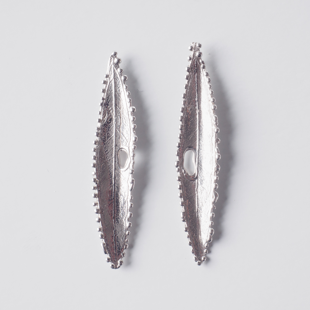Σκουλαρίκια σε σχέδιο φύλλου ελιάς με λεπτομέρειες δροσοσταλίδων στα τελειώματα τους και ξεχωριστά φινιρίσματα στον σχεδιασμό τους. Ένα ιδιαίτερο ζευγάρι σκουλαρικιών που μπορεί να συνδυαστεί με το αντίστοιχο δαχτυλίδι της σειράς για μία ολοκληρωμένη εμφάνιση.