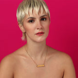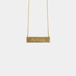The necklace’s pendant is made of brass and is gold plated.