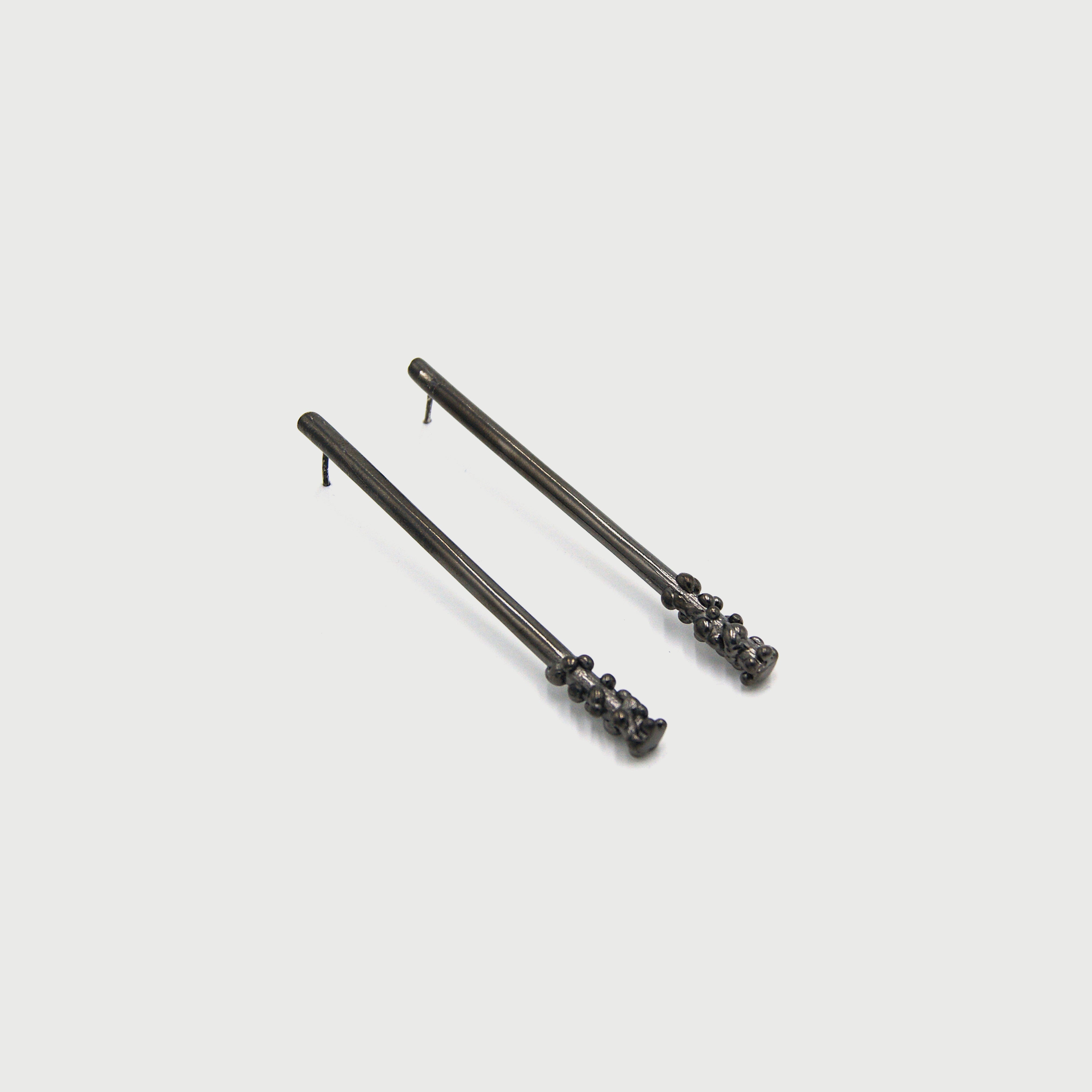 The earrings are made of bronze plated in dark rhodium. The base of the stud part of the earring is made of silver 925. The earring backs are made of silicone.