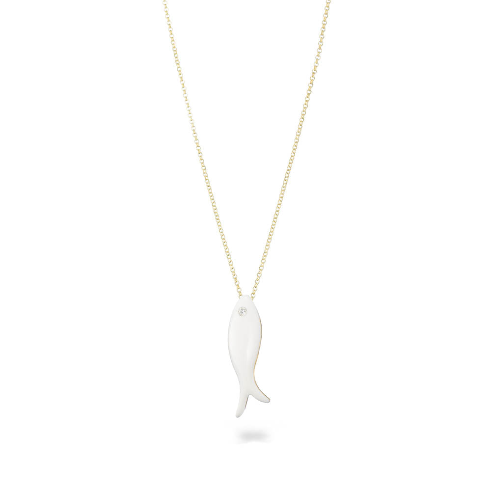 The small fish with stone - chain necklace - white enamel